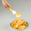 ポテチの手は、全長18cmで、柄の部分にある「指可動スイッチ」を押すと、人差し指と親指を模した「フィンガーパーツ」がポテトチップスをつまみ、自分の手を汚さずにパソコン操作やビデオ鑑賞、読書の時でも気兼ねなく「ながら食べ」ができる、ポテトチップス専用のマジックハンドだ。