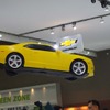 GMは3月31日午前、ソウルモーターショーでプレスカンファレンスを実施した。約15分のカンファレンスが終わるころ、何やら頭上に黒い影。ふと天井を見上げるとそこにはお馴染みの黄色いシボレー『カマロ』が宙を漂っていた。