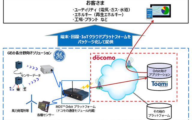 今回の提携で、インフラ設備を持つ民間企業や自治体などは、遠隔地の道路や橋梁、プラントや電気・ガス・水道等の設備にドコモの通信モジュールを内蔵したGEのMDS-オービットを設置することで、インフラ設備の温度や振動などの稼働データをリアルタイムに監視できる。