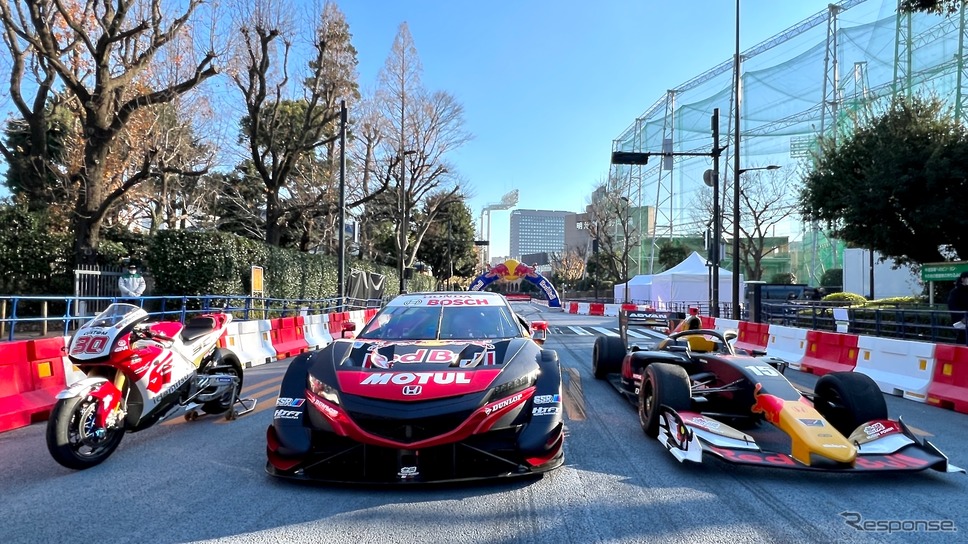 東京・神宮外苑の公道を使ったモータースポーツイベント「Red Bull Race Day」が19日、開催された。今シーズンのSUPER GTスーパーフォーミュラに加えて、2輪最高峰であるMotoGPのカテゴリーを戦ったRed Bullチームの3台が、公道走行やパフォーマンスを行ない、集まったファンを楽しませた。