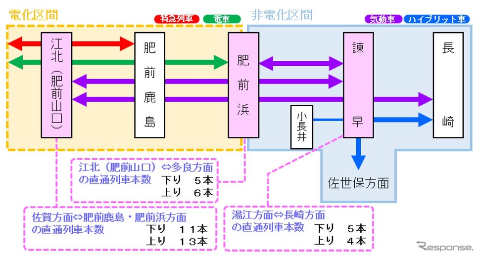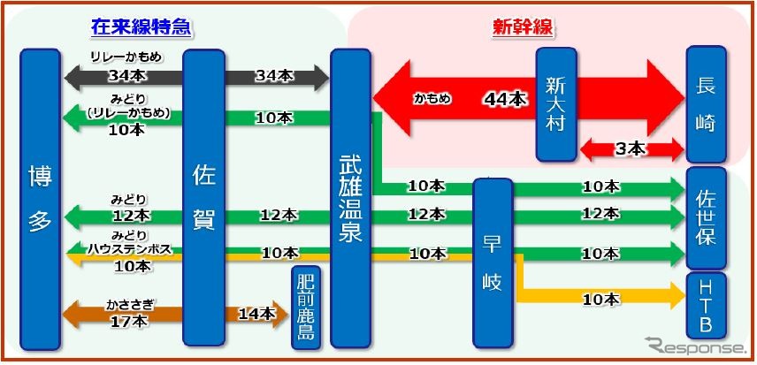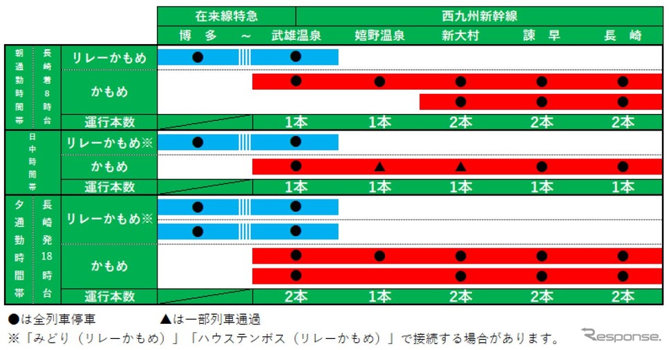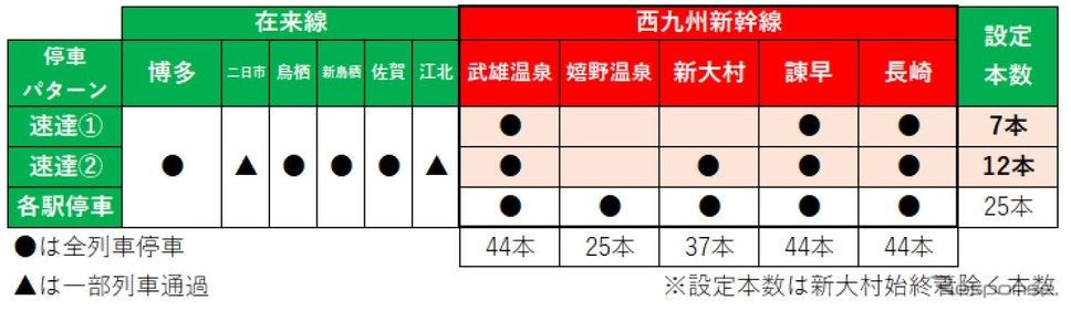 全線を走る列車のうち、途中、諫早駅(長崎県諫早市)のみに停車する最速達列車が7本、嬉野(うれしの)温泉駅(佐賀県嬉野市)を通過する速達列車が12本設定され、残る25本が各駅停車となる。最速列車は武雄温泉~長崎間を23分で結ぶ。
