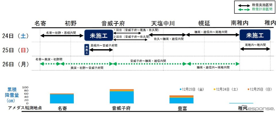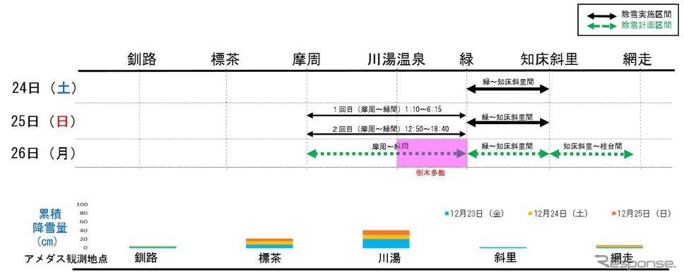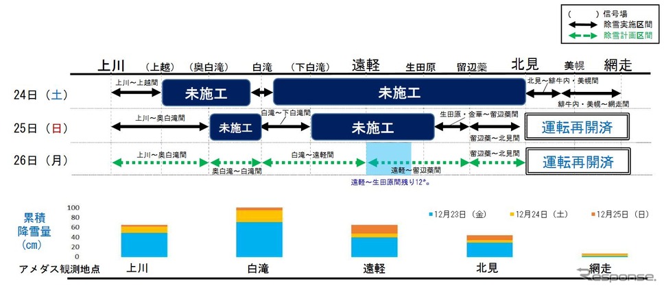 宗谷本線では12月28日に特急から再開、石北本線では西留辺蘂~北見間が12月27日16時頃に再開する予定だが、除雪作業が難航している上川~西留辺蘂間は「少なくとも12月29日までの運転再開は困難であり、見込みも立っていない状況です」としている。