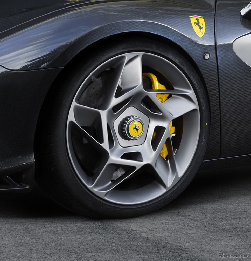 特殊な形状をした5本スポークのホイールは、この1台のための専用デザイン。フェラーリのスポーツ・プロトタイプや伝説的な『F40』に採用されていたクラシックなリムを、現代風にアレンジしている。深く彫り込まれた部分と、軽量化のために設けられた大きな開口部が、ホイール全体の美しさと切り離せないデザインの一部となっているという。