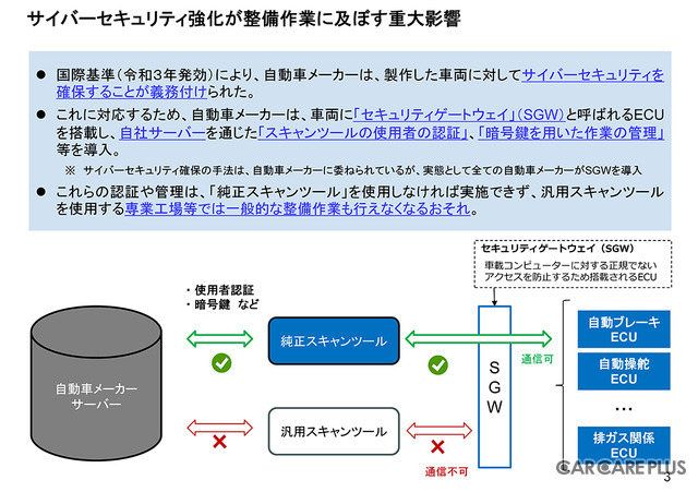 近年の慢性的な整備士不足と働き方改革の推進によって自動車ディーラーの整備対応能力が限界に近づいている。この流れに追い打ちをかけるのが、自動車メーカーがサイバーセキュリティ対応のため、車両に「セキュリティゲートウェイ(SGW)」というECUを搭載し自社サーバーを通じた「スキャンツールの使用者認証」や「暗号鍵を用いた作業の管理」などの導入を進めていることだ。