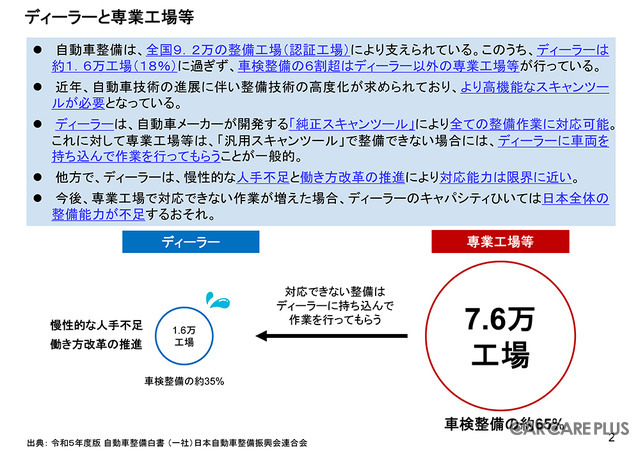 新しい車両の整備を行うためには、ディーラーが保有する「純正スキャンツール」が必要となるケースが増えている。なぜなら、セキュリティー強化の観点から車両と通信が行える機器(スキャンツール)に対して制限を加える必要性が自動車メーカーにはあるからだ。しかし、前述のようにディーラーの整備対応能力は限界が近く、このまま街の整備工場で対応ができない整備作業が増えると、日本全体の整備能力が不足し、多くの整備難民が発生しかねない。