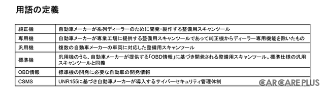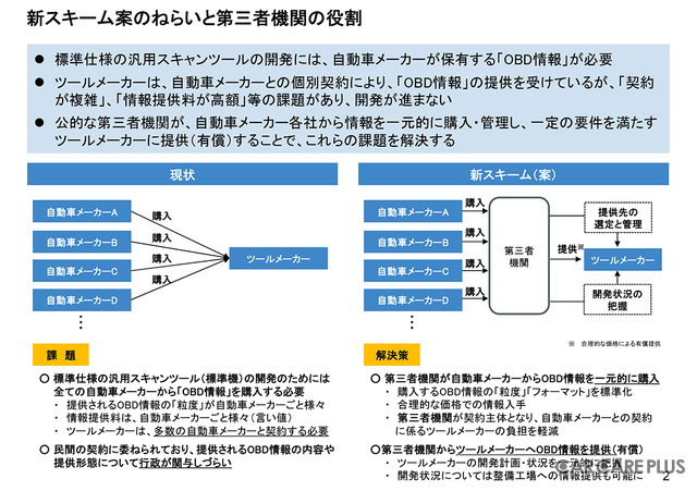 試案において、整備用スキャンツールの分類について、自動車メーカーが系列ディーラーのために開発・製作するいわゆる「純正機」と、純正機からディーラー専用機能を除いた「専用機」に区分されることが定義された。また、汎用スキャンツールのうち、自動車メーカーから提供される技術情報を活用して開発するものを「標準機」とすることも定義され、自動車メーカーからの技術情報を国が定めた第三者機関が一元的に購入することで、合理的な価格でかつ情報の粒度とフォーマットを標準化した形でツールメーカーは情報の提供を受けることが可能になると解決策が示された。