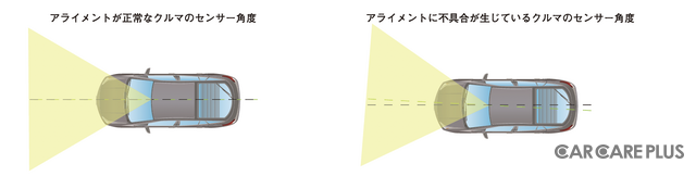 アライメントが狂うことで、正しく車線や前方車両の位置を認識できなくなると「車線から逸脱していないのに警告が出る」「必要な時にブレーキが作動しない」といった機能の低下や誤作動のリスクが高まる。