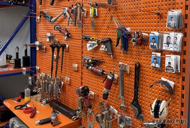 小野氏が考案した作業工程管理の一環として、工具類の整理整頓が徹底されている点も重要な特徴と言える。工具棚には現在の使用者がわかるように、工具を持ち出す際にメカニックの顔写真の札を工具棚の所定位置に掲示する整理整頓の仕組みが完成され、メカニックたちに定着している。