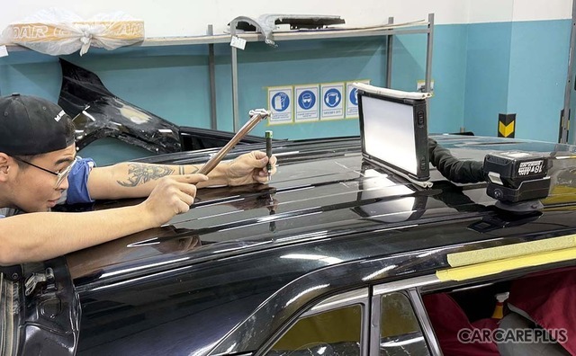 モンゴルでは制度上、経済全損になることが少なく、日本で全損扱いになる大破車両の修理依頼も多いため、高性能なフレーム修正機や高度なBP技術が不可欠と言える。メカニックたちは紫外線硬化パテやデントリペアツールを利用した外板修正も行なっており、ボディの状態に適した最良の修理が取り入れられていることがわかる。