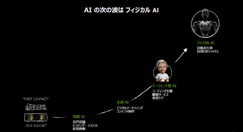 ディープラーニングと生成AIを経て、現在はAIエージェントが注目されています。そしてNVIDIAは次の大きな潮流として「フィジカルAI」が来ると確信しています。